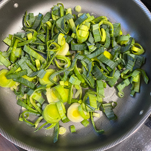 In a large pan, sauteé avocado oil, green onions, and the chopped leek