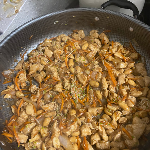 Toss in peanuts, carrots, soy sauce, teriyaki sauce, and sprouts